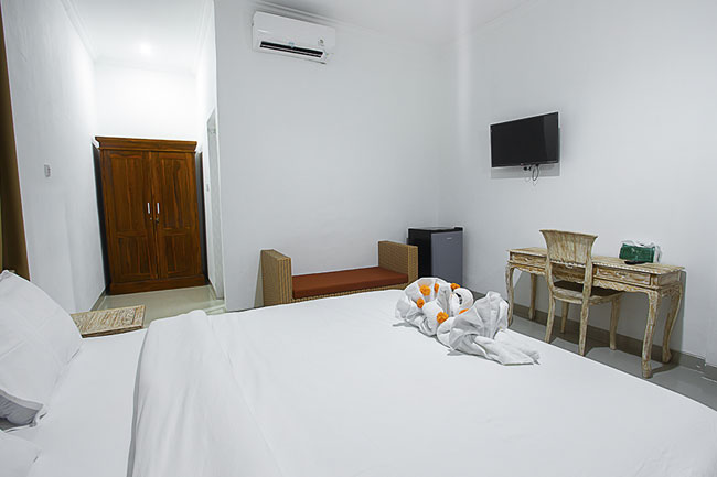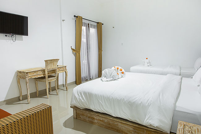 One Suite room available. Bigger space than Deluxe room. Each room equipped with comfortable double bed, one extra single bed, bigger closet, nightstand, chair and desk with drawers, hot/cold shower water, air condition, wifi with high speed internet, daily mineral waters, morning fruits, fresh towels, sofa, fridge and TV.